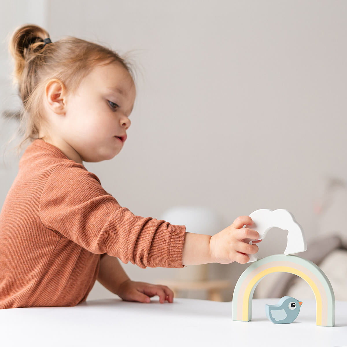 Tu peque podrá apilar estas 3 piezas multifuncionales dejando volar su imaginación. Y es que podrá crear sus propias figuras tratando de evitar que se caigan las piezas.