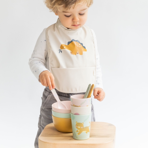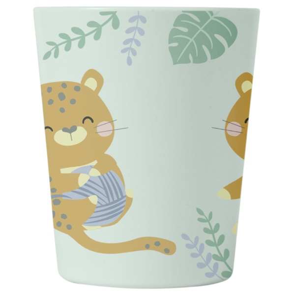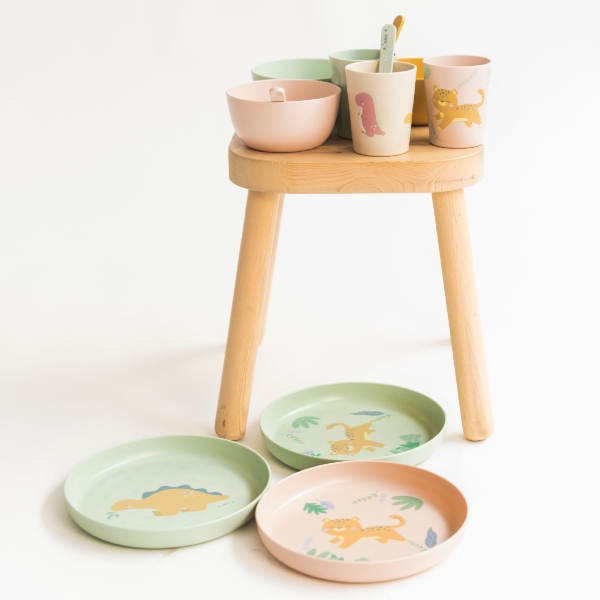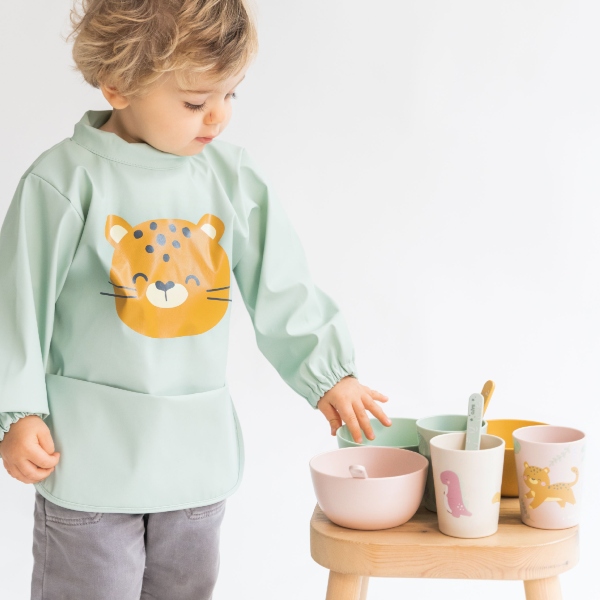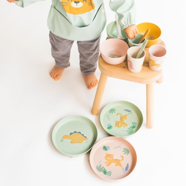 Vajilla compuesta por plato, bol, vaso, cuchara y tenedor. Con temática de guepardos y en unos colores super alegres. Ideal para que los peques empiecen a comer solitos.
