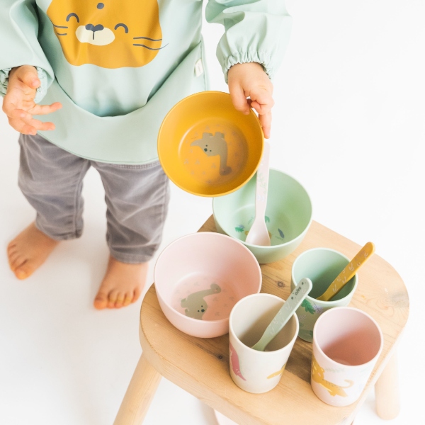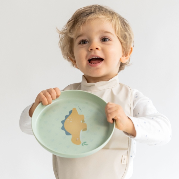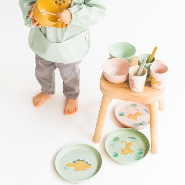 Vajilla compuesta por plato, bol, vaso, cuchara y tenedor. Con temática de dinosaurios y en unos colores super alegres. Ideal para que los peques empiecen a comer solitos.